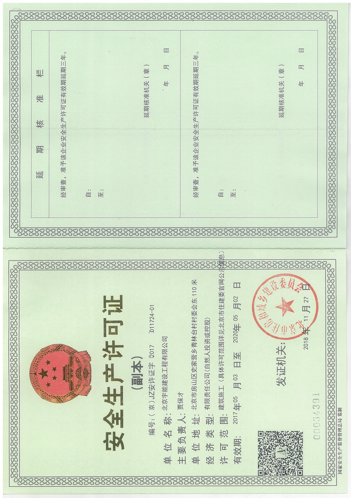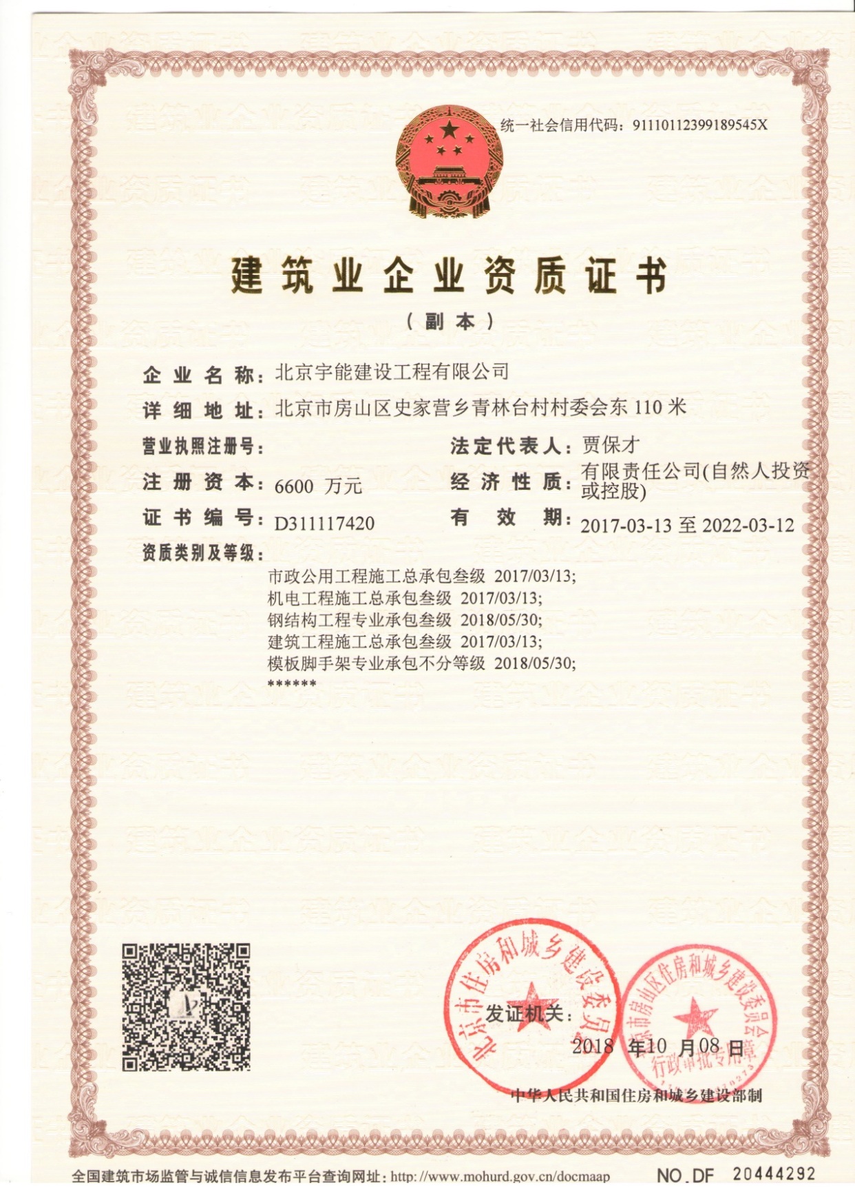 北京宇能建設(shè)工程有限公司成立于2014年5月16日,前身是北京博遠(yuǎn)天宇電力科技有限公司,注冊(cè)資金6600萬元。具有《市政公用工程施工總承包叁級(jí)》、《機(jī)電工程施工總承包叁級(jí)》、《建筑工程施工總承包叁級(jí)》、《建筑裝修裝飾工程專業(yè)承包貳級(jí)》、《電子與智能化工程專業(yè)承包貳級(jí)》、《鋼結(jié)構(gòu)工程專業(yè)承包叁級(jí)》、《防水防腐保溫工程專業(yè)承包貳級(jí)》、《建筑幕墻工程專業(yè)承包貳級(jí)》、《模板腳手架資質(zhì)》等;同時(shí)榮獲AAA誠信企業(yè)證書、AAA級(jí)誠信經(jīng)營示范單位、AAA重合同守信用企業(yè)證書、AAA級(jí)企業(yè)資信等級(jí)證書。鑒于公司領(lǐng)導(dǎo)的為人誠信,作風(fēng)良好,經(jīng)315全國征信系統(tǒng)誠信企業(yè)認(rèn)證中心頒發(fā)誠信企業(yè)家榮譽(yù)證書及誠信經(jīng)理人的榮譽(yù)稱號(hào)。